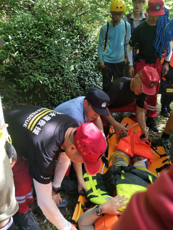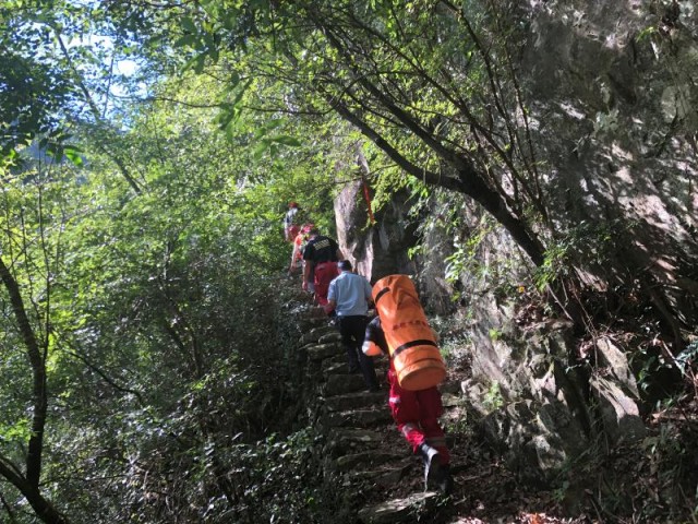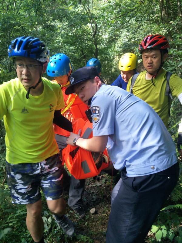 随即救援人员将伤者抬上卷式担架。由于现场地形复杂,整个下山过程充满了艰辛,民警王翔在下山过程中还不慎摔倒受了伤。